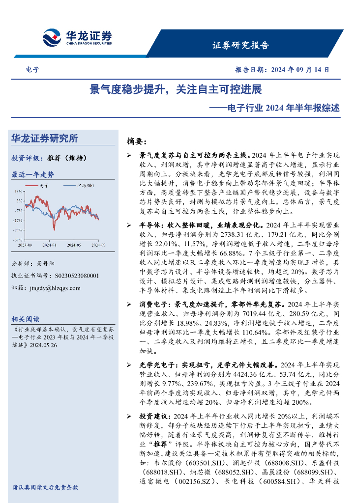 华龙证券:电子行业2024年半年报综述:景气度稳步提升,关注自主可控进展.pdf
