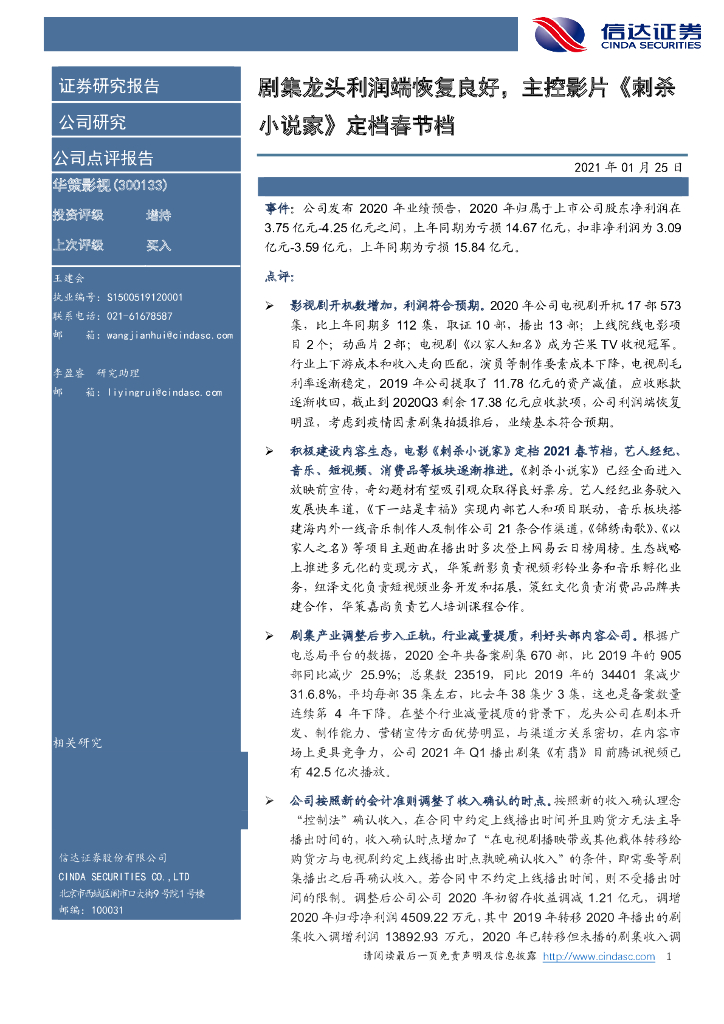信达证券:华策影视(300133)-剧集龙头利润端恢复良好,主控影片《刺杀小说家》定档春节档.pdf
