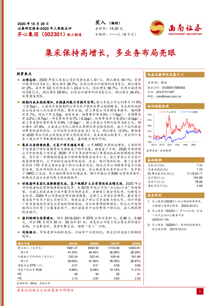 西南证券:齐心集团(002301)-集采保持高增长,多业务布局亮眼.pdf