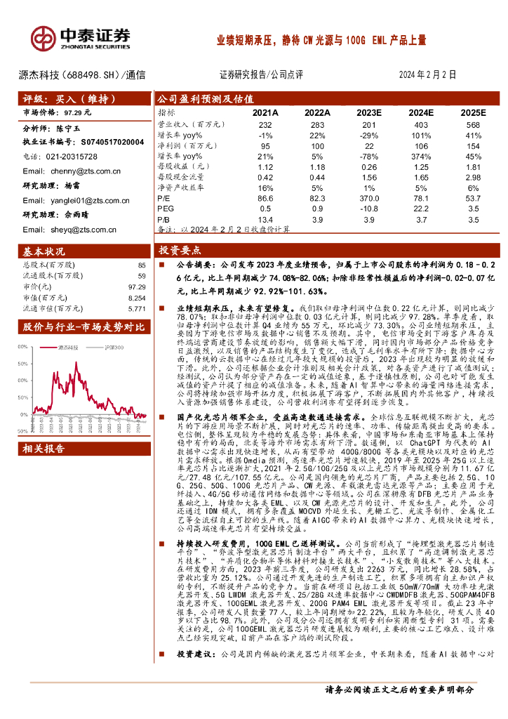 中泰证券:源杰科技(688498)-业绩短期承压,静待CW光源与100 GEML产品上量.pdf
