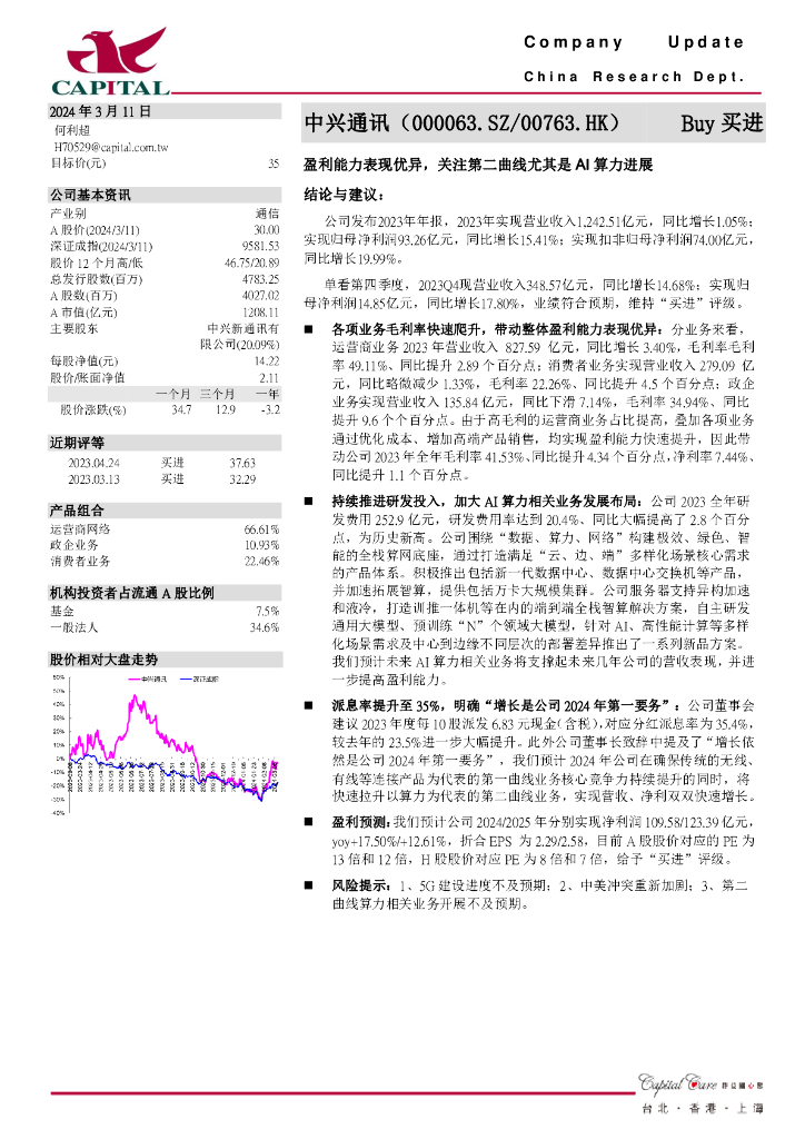 群益证券:中兴通讯(000063)-盈利能力表现优异,关注第二曲线尤其是AI算力进展.pdf
