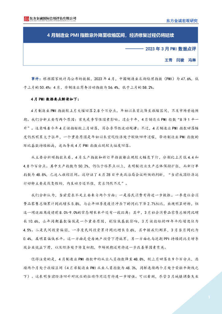 东方金诚:4月制造业PMI指数意外降至收缩区间,经济修复过程仍将延续(2023年4月PMI数据点评).pdf
