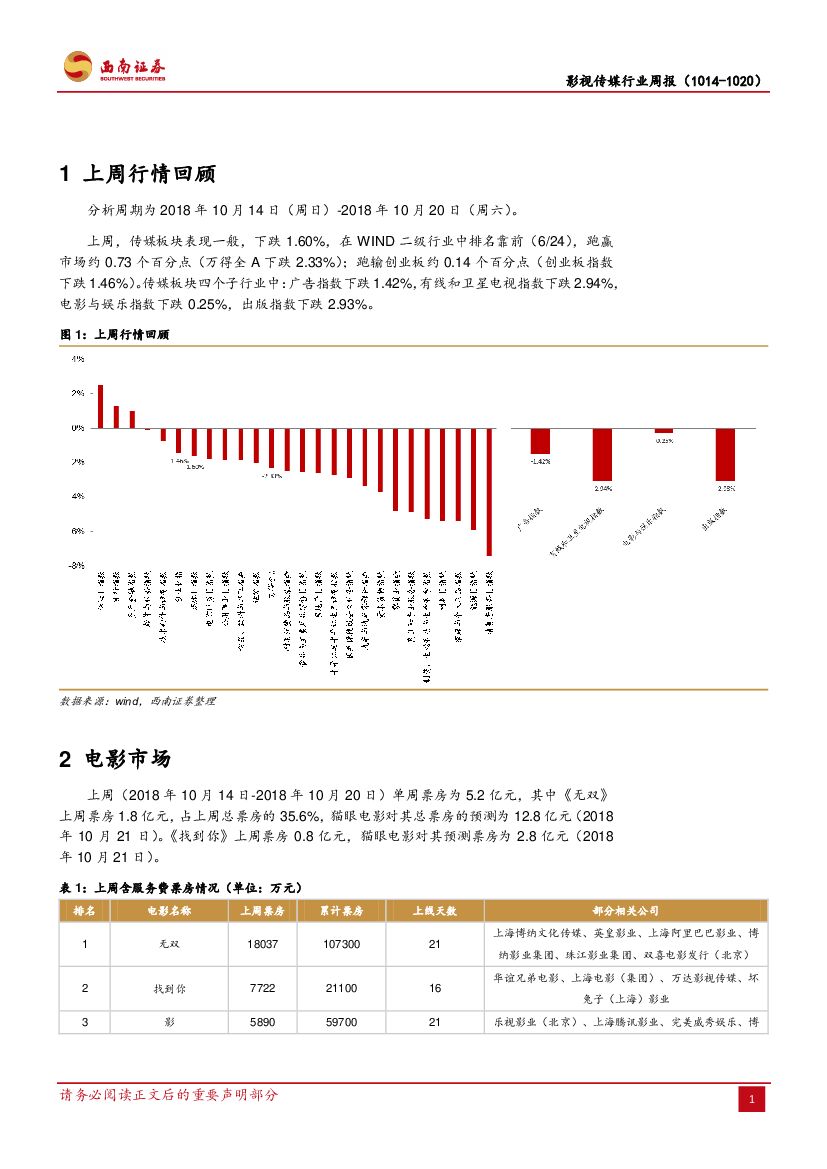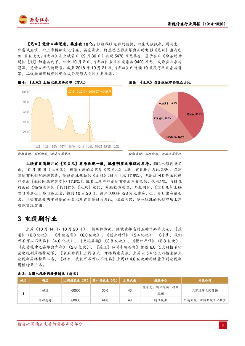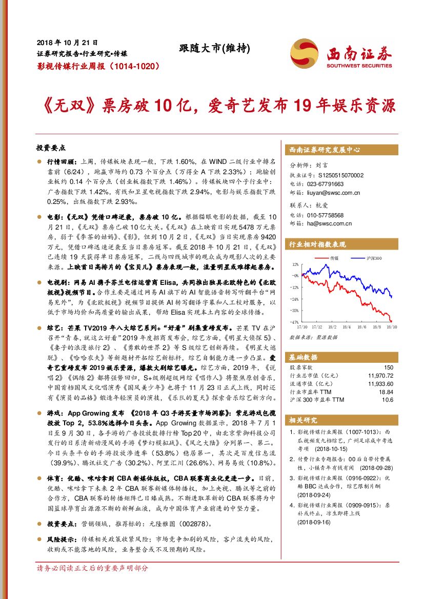西南证券:影视传媒行业周报:《无双》票房破10亿,爱奇艺发布19年娱乐资源.pdf