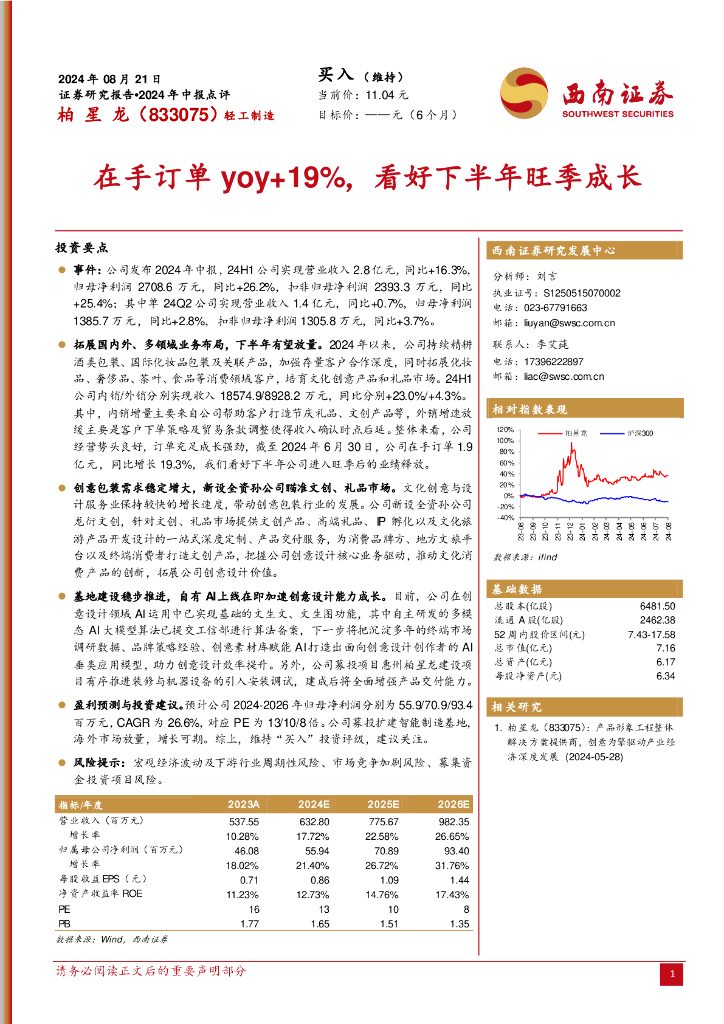 西南证券:柏星龙(833075)-2024年中报点评:在手订单yoy+19%,看好下半年旺季成长.pdf