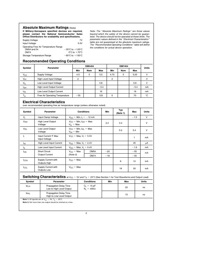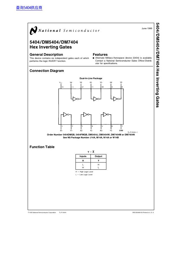 National Semiconductor 5404/DM5404/DM7404 Hex Inverting Gates 数据手册.pdf