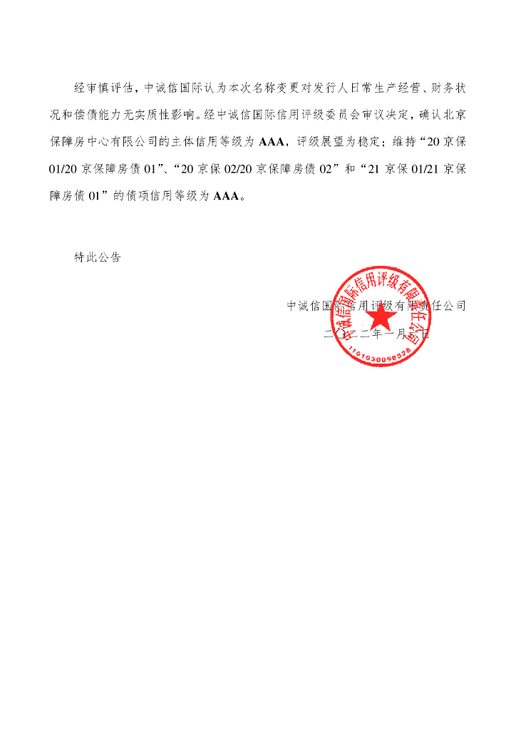 中诚信:中诚信国际关于确认北京保障房中心有限公司主体及相关债项信用等级的公告.pdf