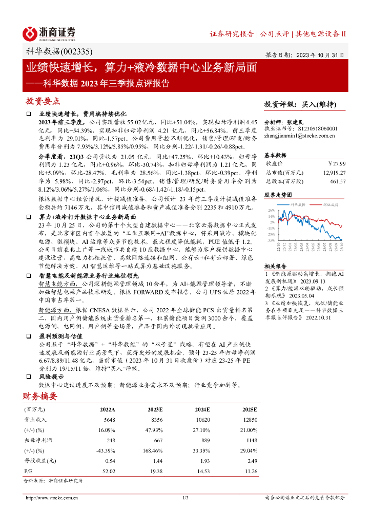 浙商证券:科华数据(002335)-业绩快速增长,算力+液冷数据中心业务新局面.pdf