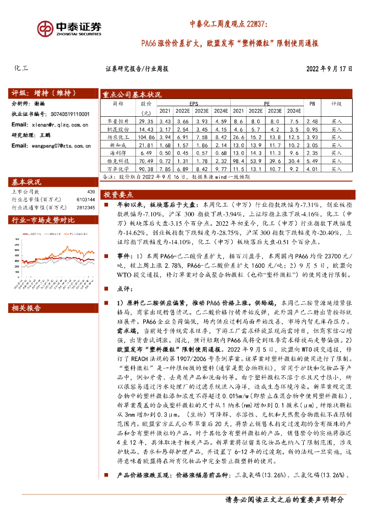 中泰证券:中泰化工周度观点22W37:PA66涨价价差扩大,欧盟发布“塑料微粒”限制使用通报.pdf