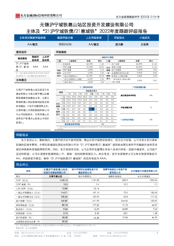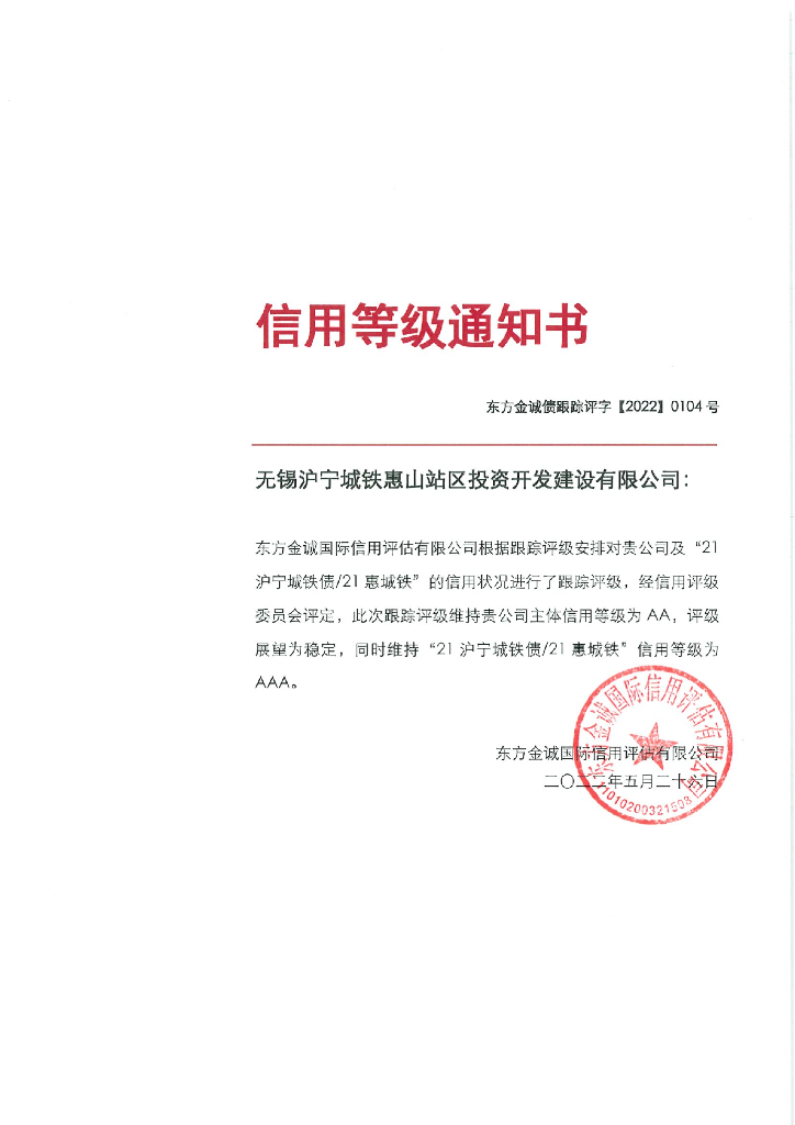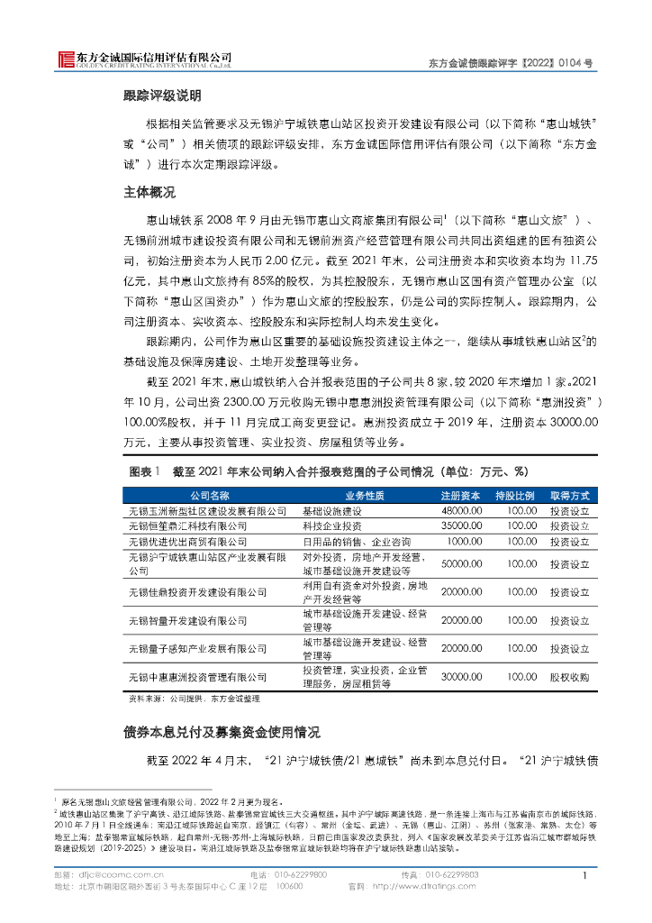 东方金诚:无锡沪宁城铁惠山站区投资开发建设有限公司主体及“21沪宁城铁债21惠城铁”2022年度跟踪评级报告.pdf