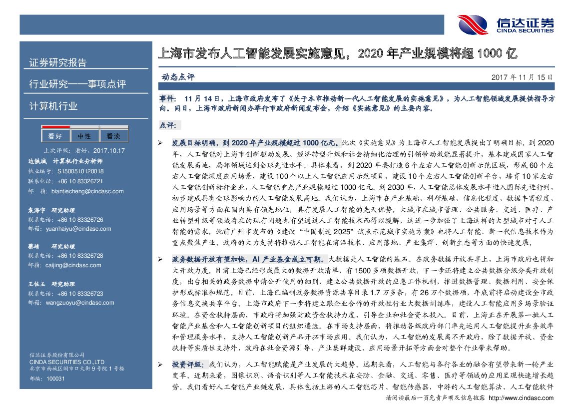 信达证券:计算机行业事件点评:上海市发布人工智能发展实施意见,2020年产业规模将超1000亿.pdf