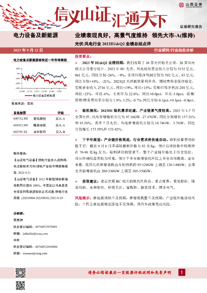 山西证券:光伏/风电行业2023H1&Q2业绩总结点评:业绩表现良好,高景气度维持.pdf
