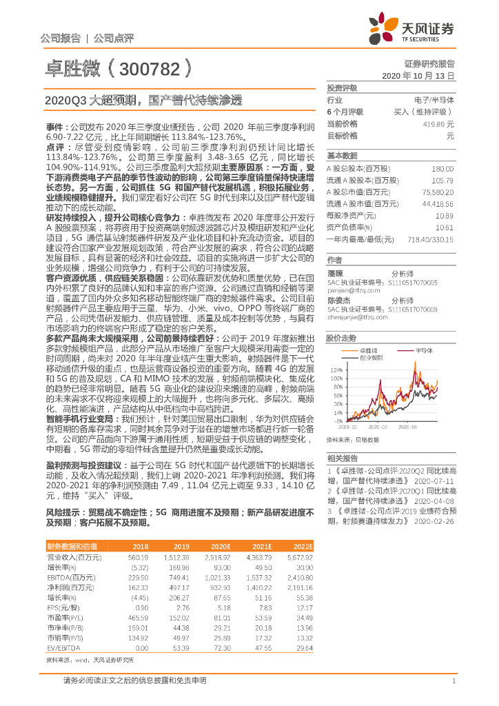 天风证券:卓胜微(300782)-2020Q3大超预期,国产替代持续渗透.pdf