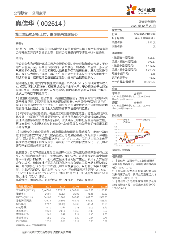 天风证券:奥佳华(002614)-第二主业拟分拆上市,彰显未来发展信心.pdf