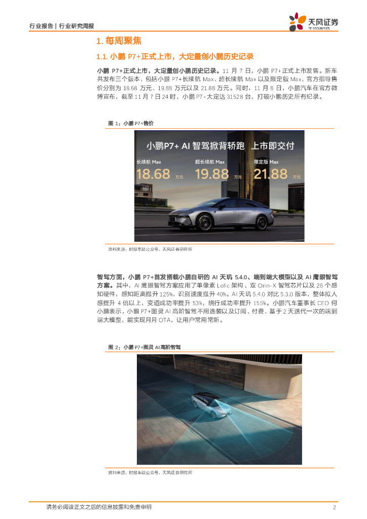 天风证券:汽车行业周报:小鹏P7+正式上市,大定量创小鹏历史记录.pdf