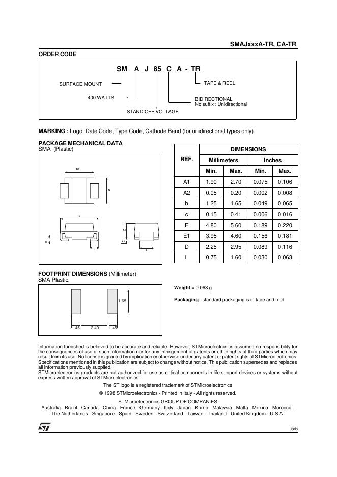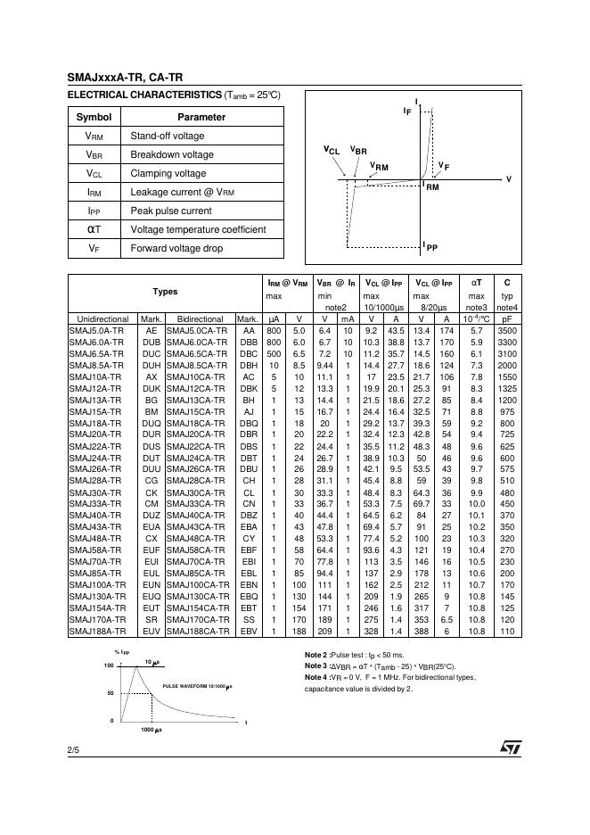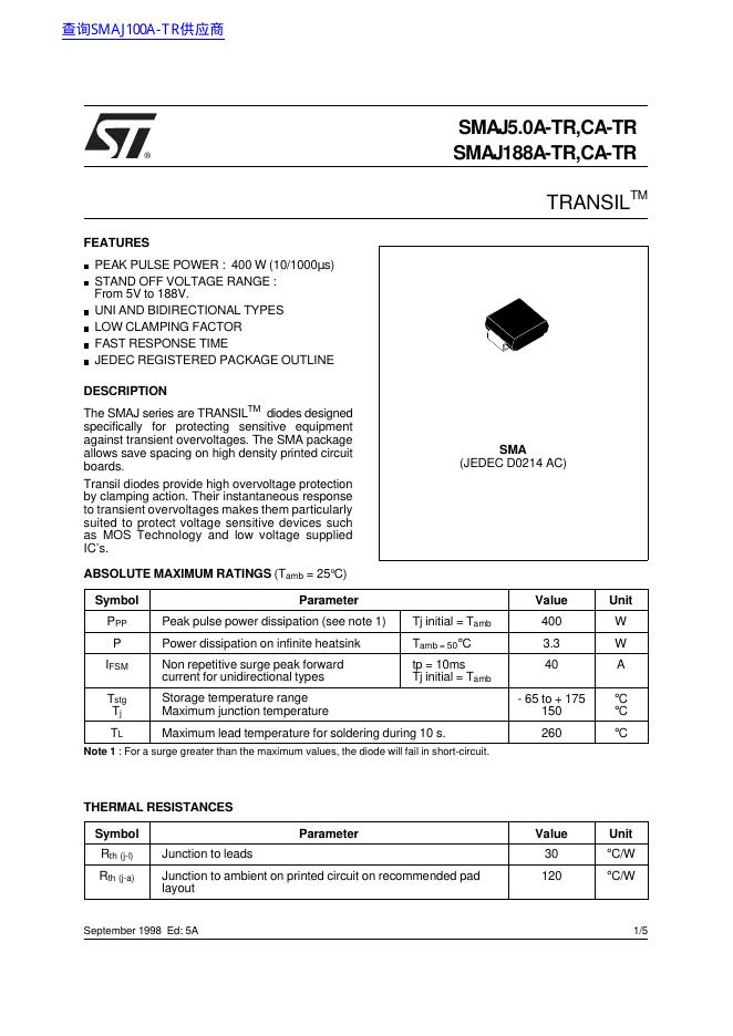 ST SMAJ5.0A-TR,CA-TR SMAJ188A-TR,CA-TR 数据手册.pdf