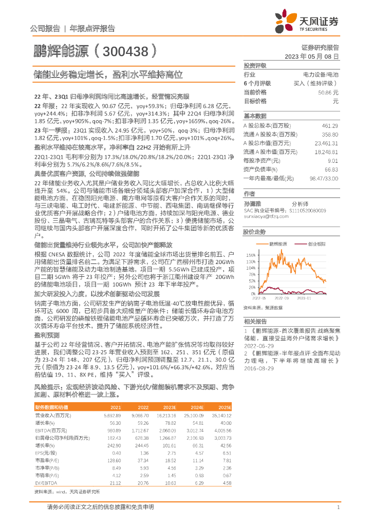 天风证券:鹏辉能源(300438)-储能业务稳定增长,盈利水平维持高位.pdf
