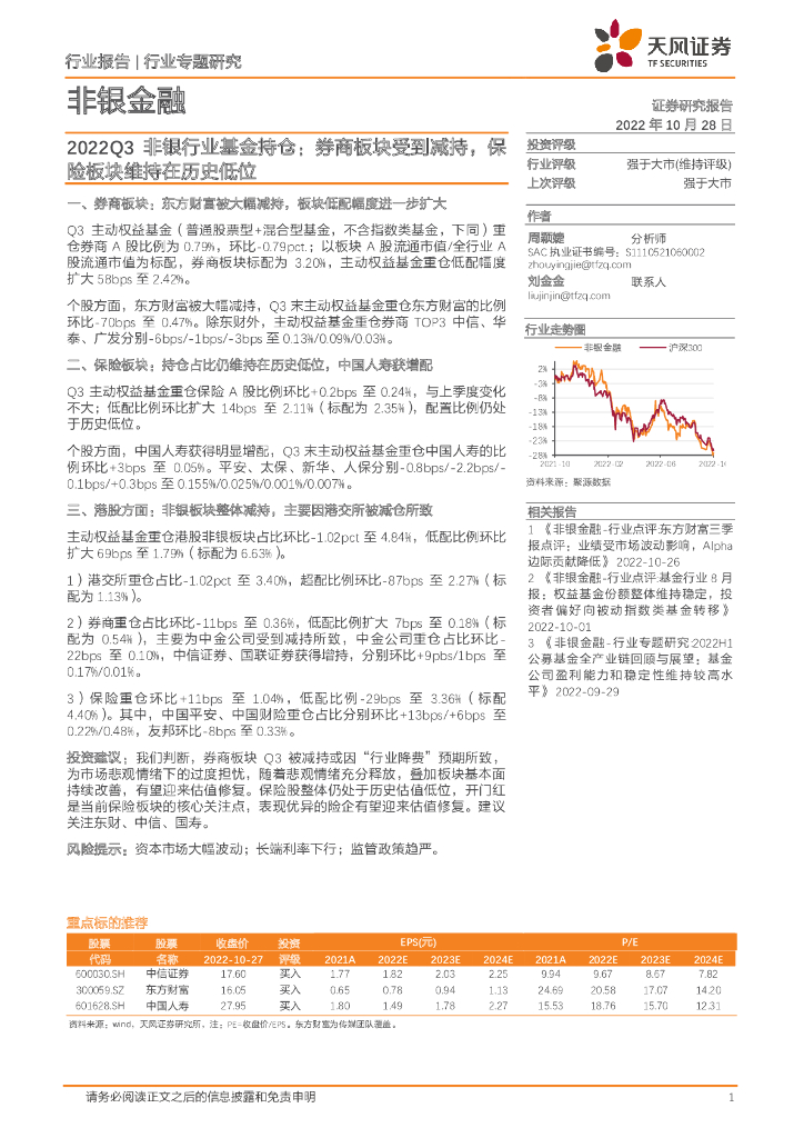天风证券:2022Q3非银行业基金持仓:券商板块受到减持,保险板块维持在历史低位.pdf