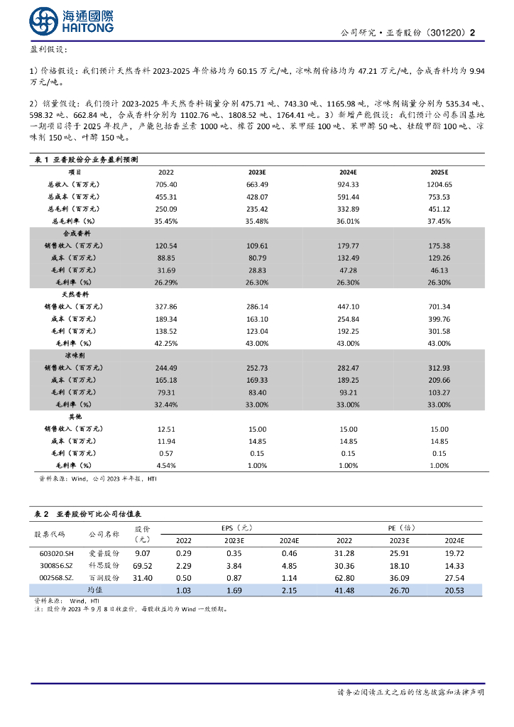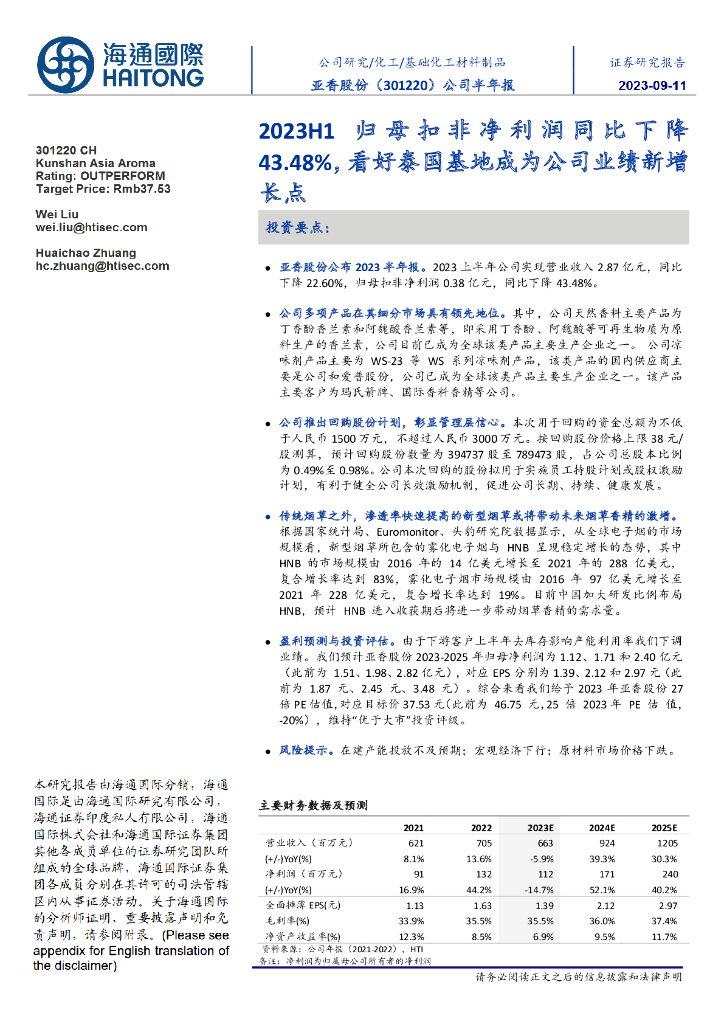 海通国际:亚香股份(301220)-公司半年报:2023H1归母扣非净利润同比下降43.48%,看好泰国基地成为公司业绩新增长点.pdf
