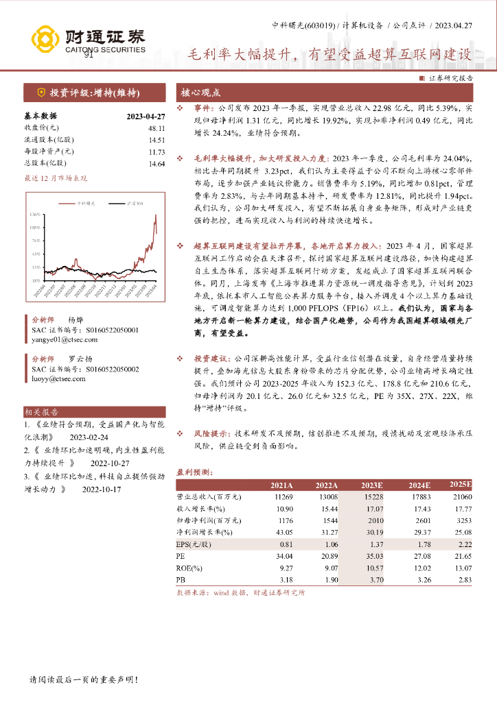 财通证券:中科曙光(603019)-毛利率大幅提升,有望受益超算互联网建设.pdf