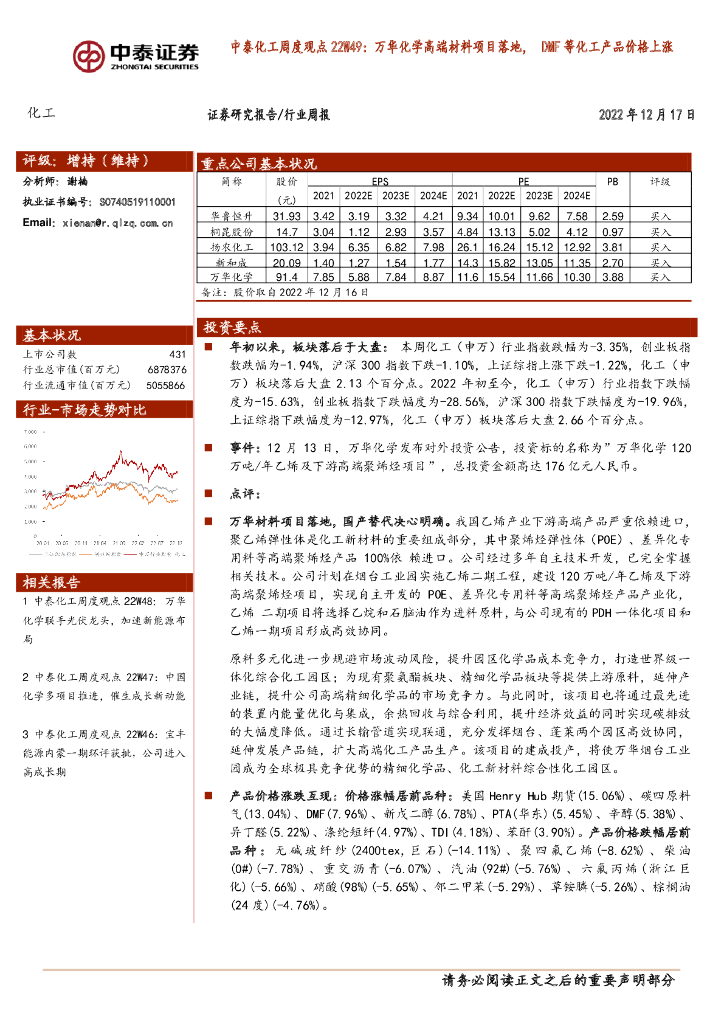 中泰证券:中泰化工周度观点22W49:万华化学高端材料项目落地,DMF等化工产品价格上涨.pdf