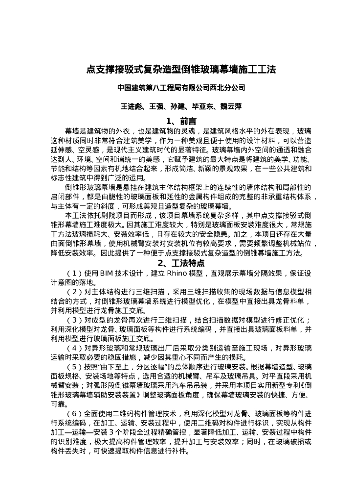 QHGF-2022061 点支撑接驳式复杂造型倒锥玻璃幕墙施工工法.doc