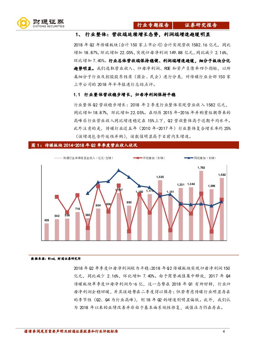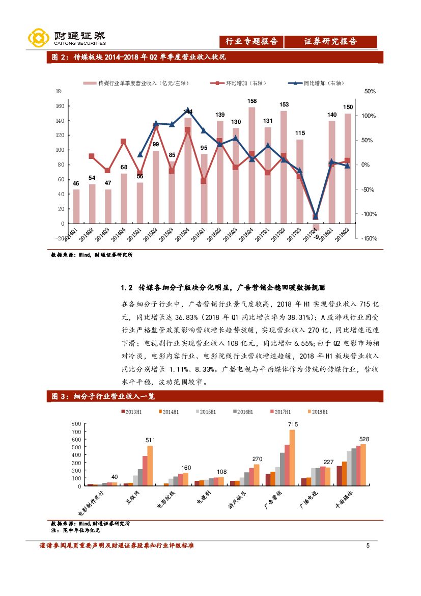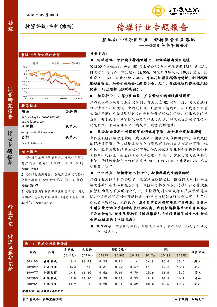 财通证券:传媒行业专题报告:2018年半年报分析-整体向上但分化明显,静待监管政策落地.pdf