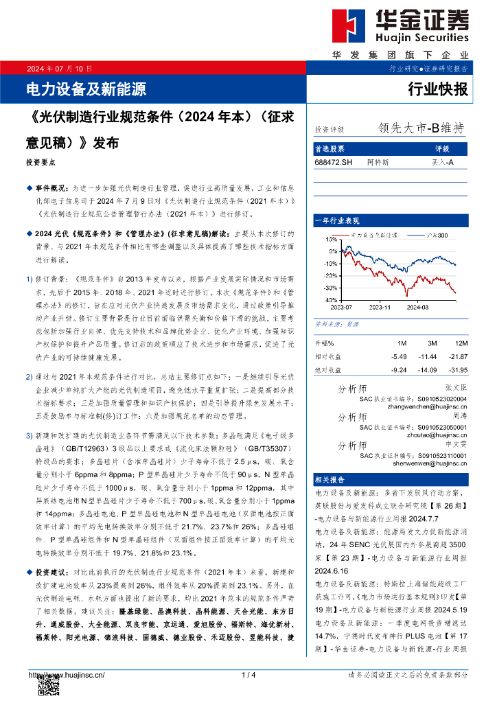 华金证券:电力设备及新能源:《光伏制造行业规范条件(2024年本)(征求意见稿)》发布.pdf