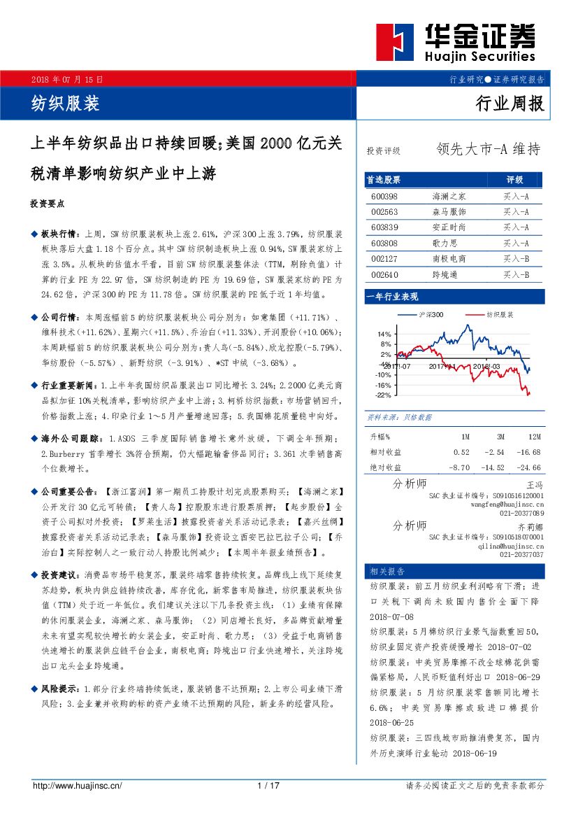 华金证券:纺织服装行业周报:上半年纺织品出口持续回暖,美国2000亿元关税清单影响纺织产业中上游.pdf