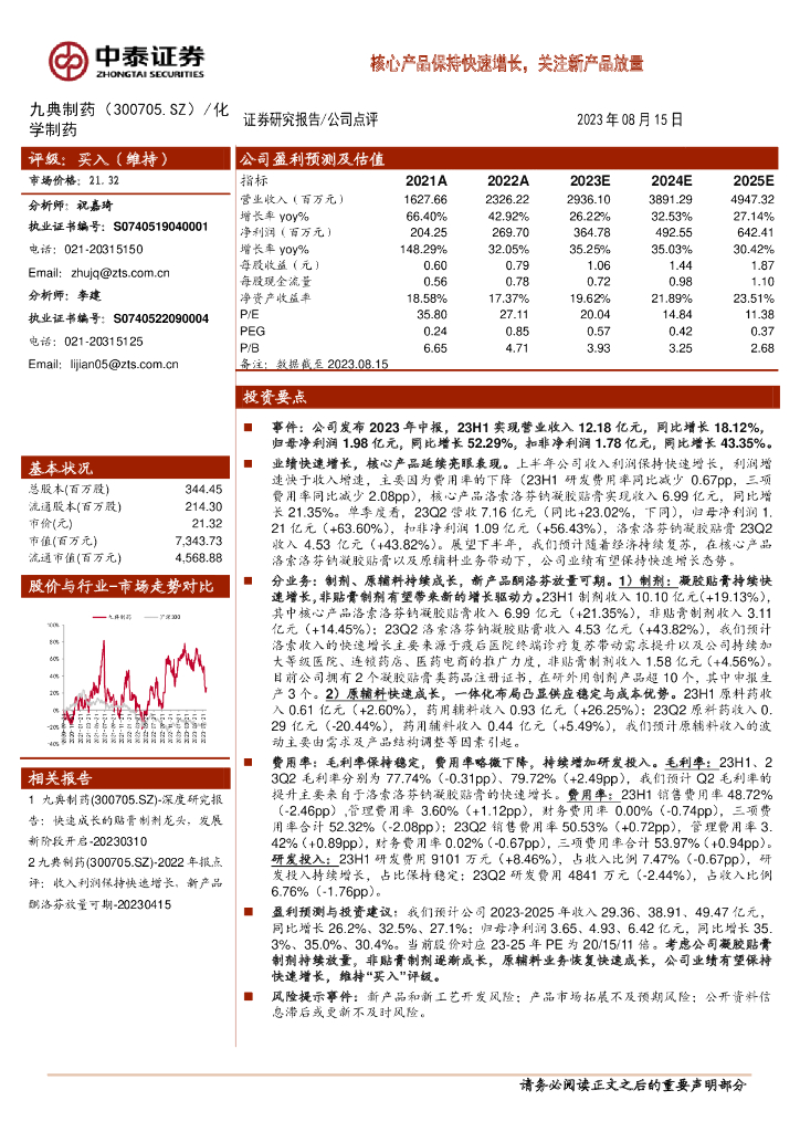 中泰证券:九典制药(300705)-核心产品保持快速增长,关注新产品放量.pdf