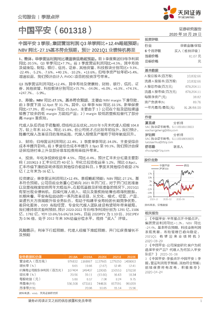 天风证券:中国平安3季报:集团营运利润Q3单季同比+12.4%略超预期;NBV同比-27.1%基本符合预期,预计2021Q1业绩转机将至.pdf