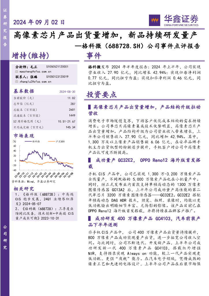 华鑫证券:格科微(688728)-公司事件点评报告:高像素芯片产品出货量增加,新品持续研发量产.pdf