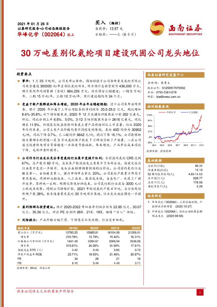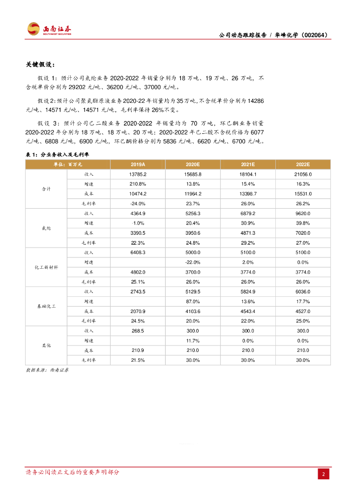 西南证券:华峰化学(002064)-30万吨差别化氨纶项目建设巩固公司龙头地位.pdf