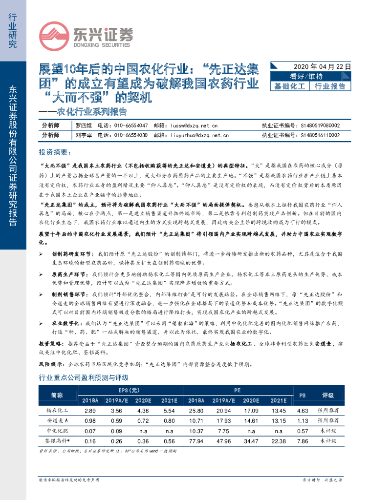 东兴证券:农化行业系列报告:展望10年后的中国农化行业:“先正达集团”的成立有望成为破解我国农药行业“大而不强”的契机.pdf