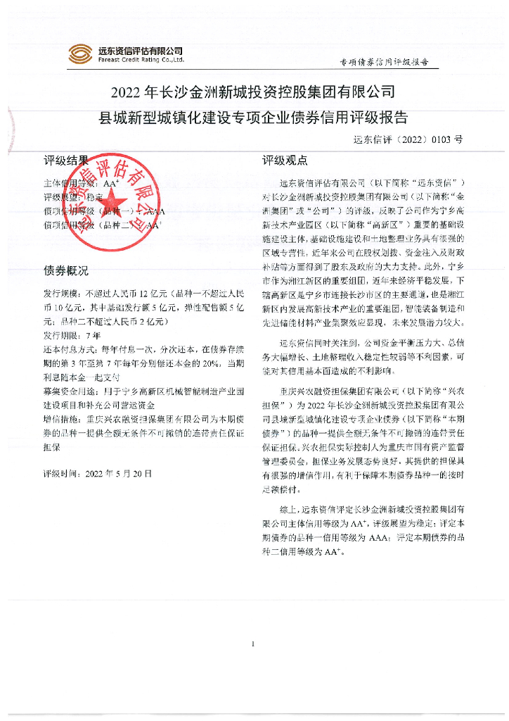 远东:2022年长沙金洲新城投资控股集团有限公司县城新型城镇化建设专项企业债券信用评级报告.pdf