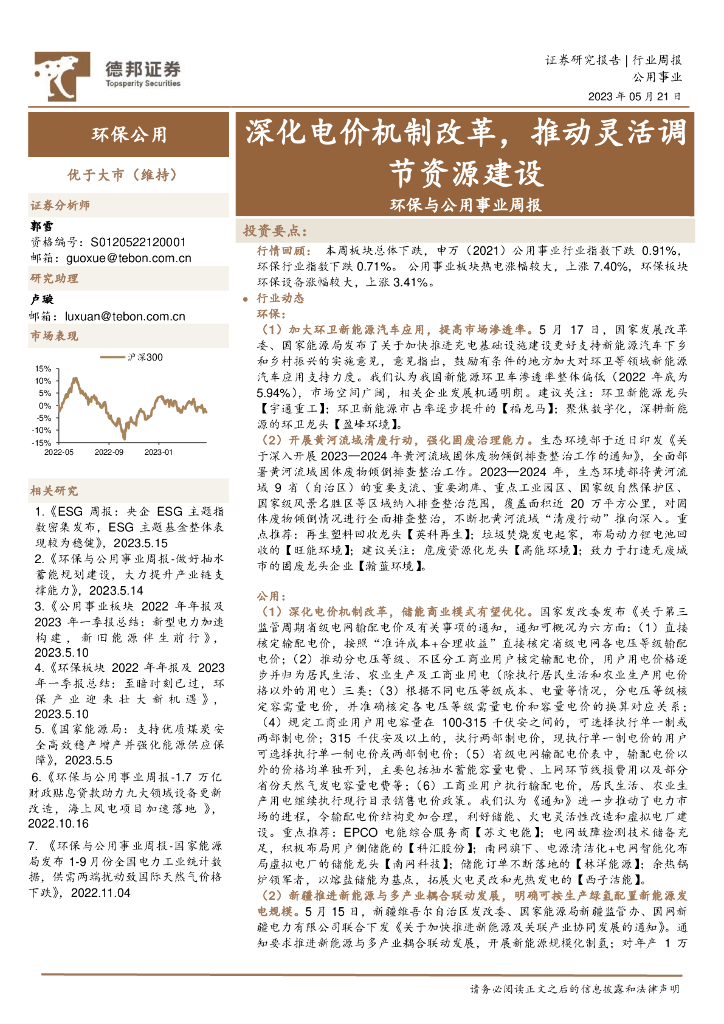 德邦证券:环保与公用事业周报:深化电价机制改革,推动灵活调节资源建设.pdf