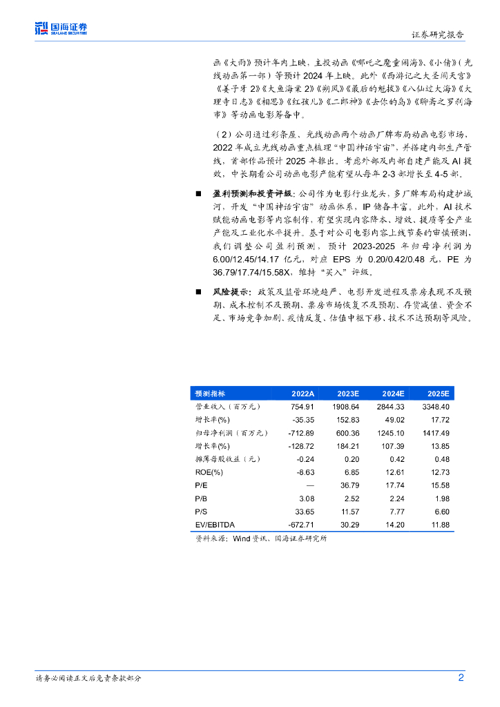国海证券:光线传媒(300251)-2023年三季报点评:Q3业绩符合预期,关注动画电影产能扩张及电影内容释放贡献业绩弹性.pdf