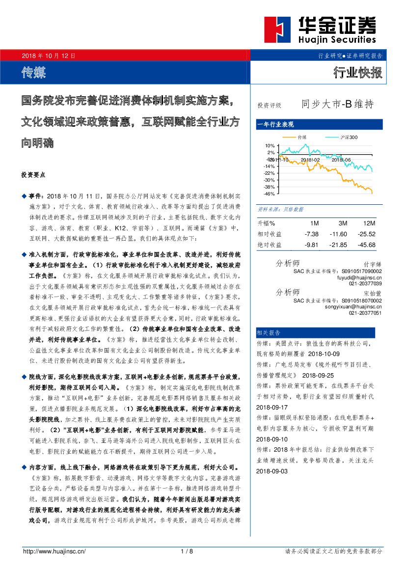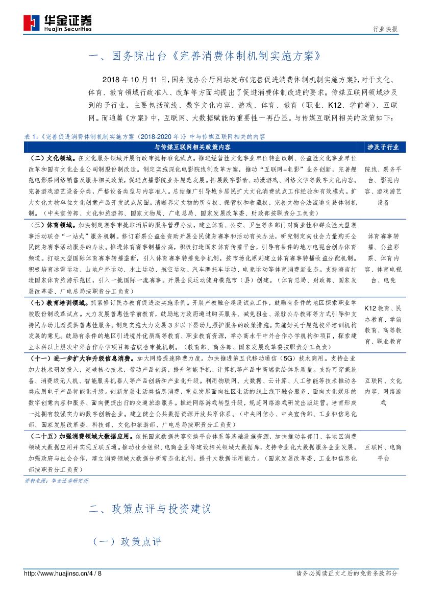 华金证券:传媒行业快报:国务院发布完善促进消费体制机制实施方案,文化领域迎来政策普惠,互联网赋能全行业方向明确.pdf