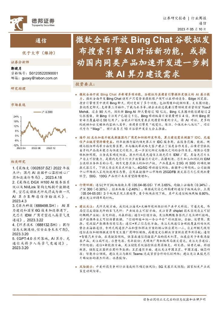 德邦证券:通信行业周报:微软全面开放Bing Chat谷歌拟发布搜索引擎AI对话新功能,或推动国内同类产品加速开发进一步刺激AI算力建设需求.pdf
