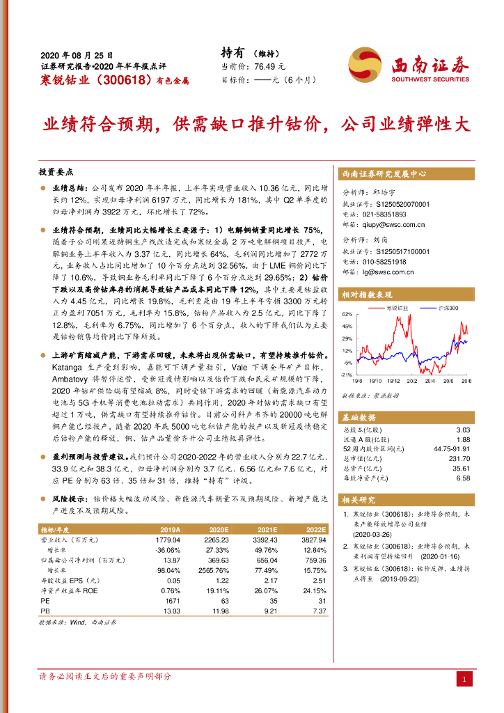 西南证券:寒锐钴业(300618)-业绩符合预期,供需缺口推升钴价,公司业绩弹性大.pdf
