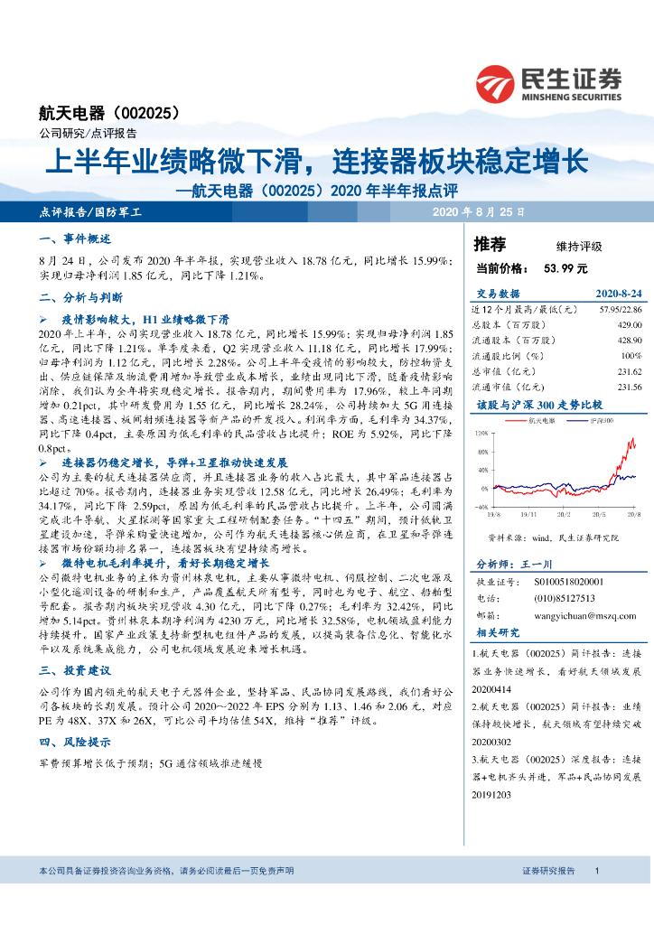 民生证券:航天电器(002025)-2020年半年报点评:上半年业绩略微下滑,连接器板块稳定增长.pdf