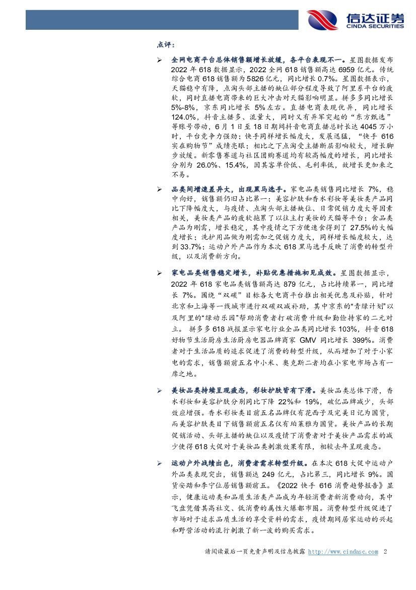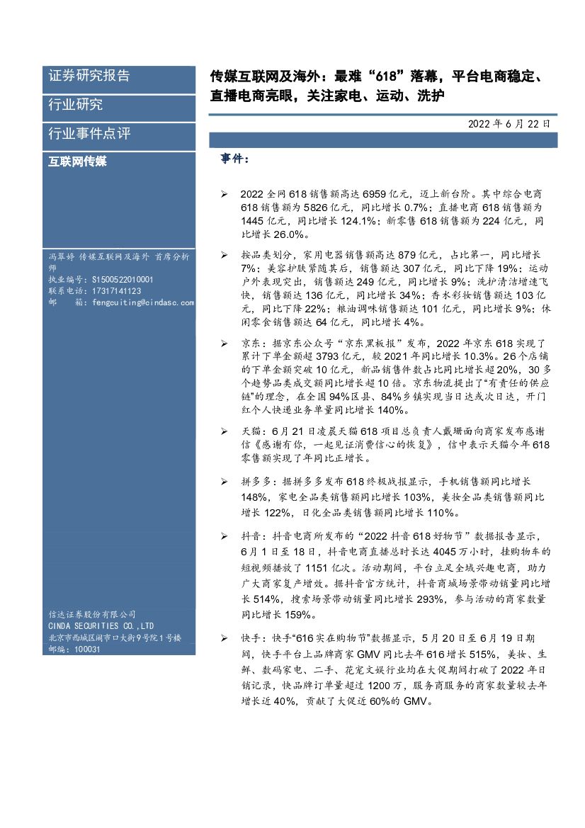 信达证券:传媒互联网及海外:最难“618”落幕,平台电商稳定、直播电商亮眼,关注家电、运动、洗护.pdf