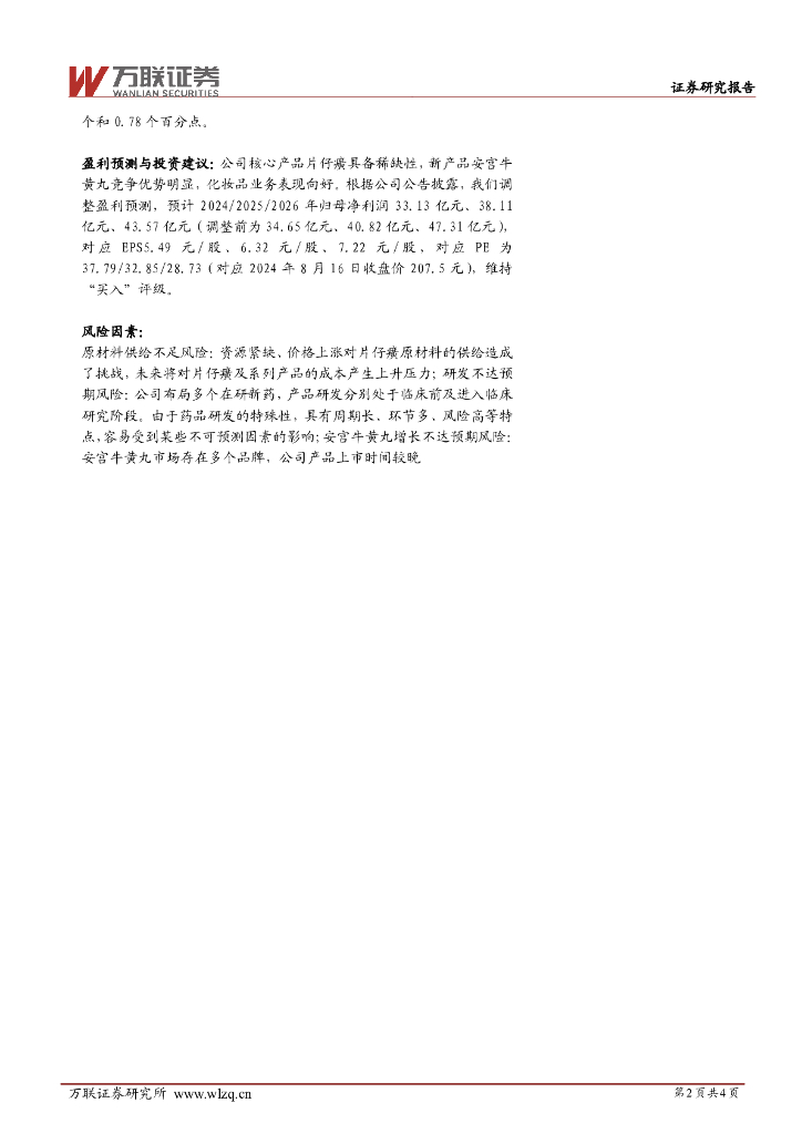 万联证券:片仔癀(600436)-点评报告:核心产品增长稳健,毛利率承压.pdf