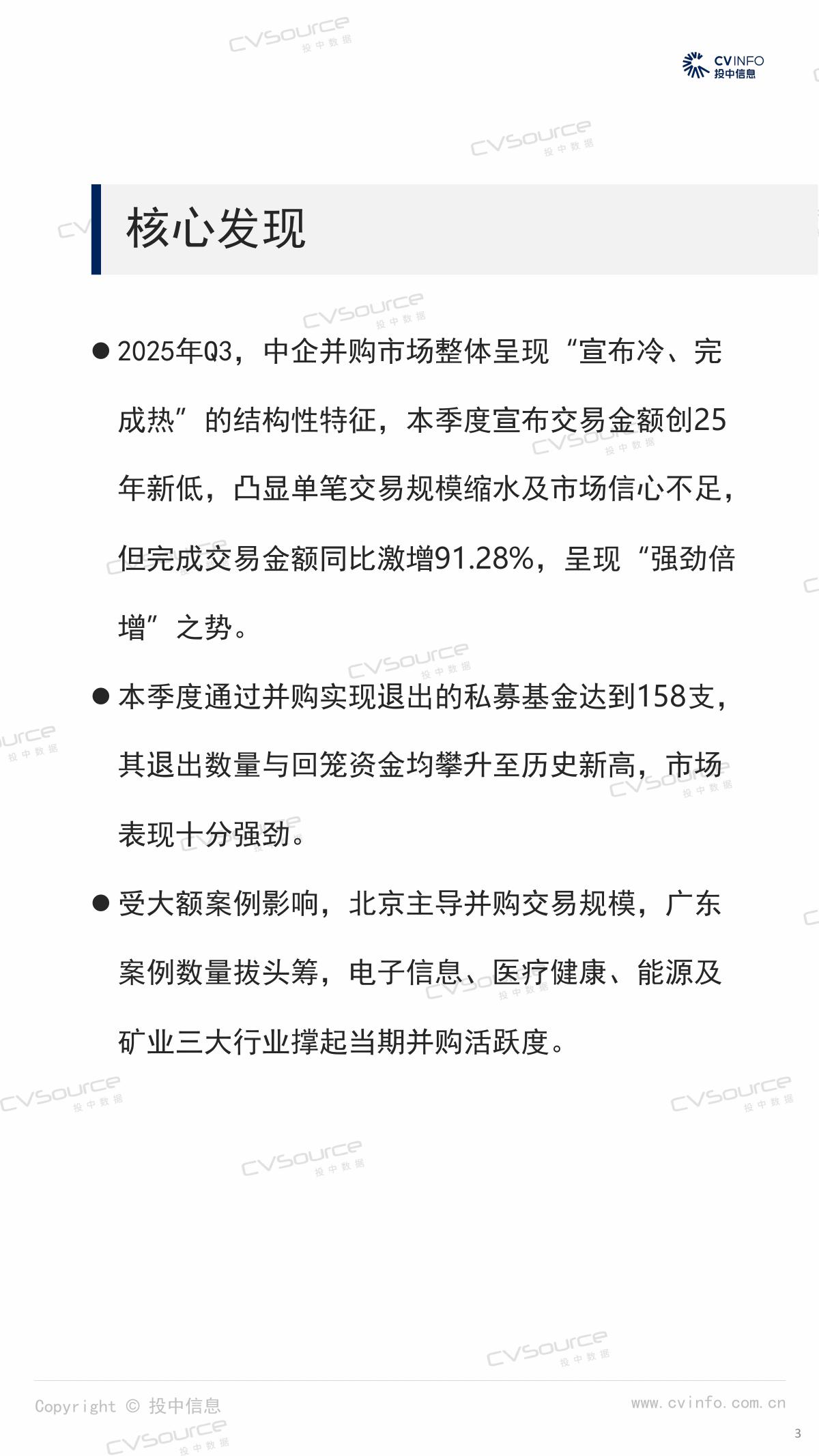 投中信息:投中统计:2025年三季度完成交易额同比飙升超九成 私募并购退出火爆.pdf