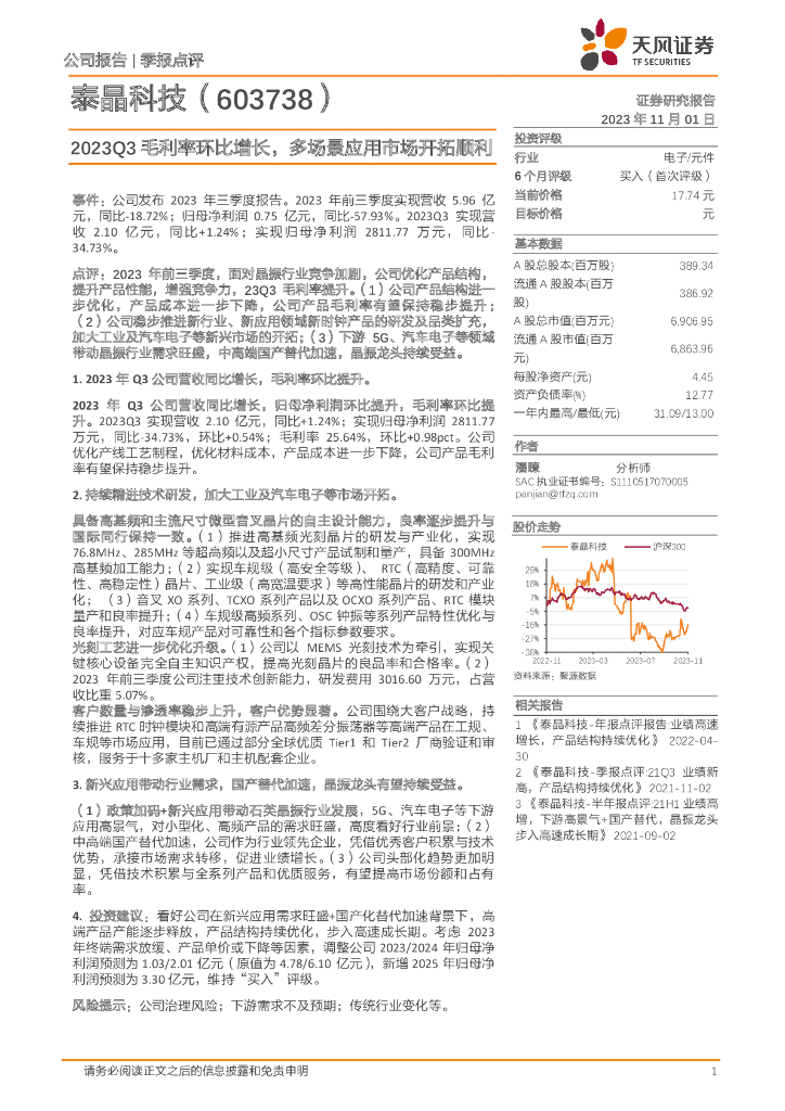 天风证券:泰晶科技(603738)-2023Q3毛利率环比增长,多场景应用市场开拓顺利.pdf