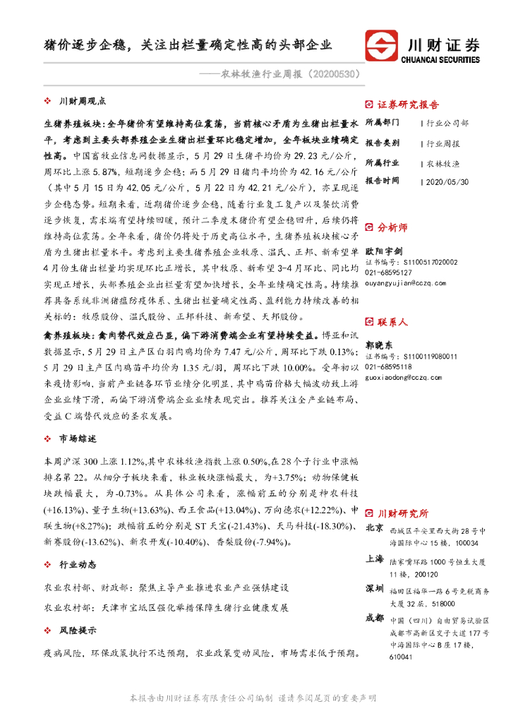 川财证券:农林牧渔行业周报:猪价逐步企稳,关注出栏量确定性高的头部企业.pdf