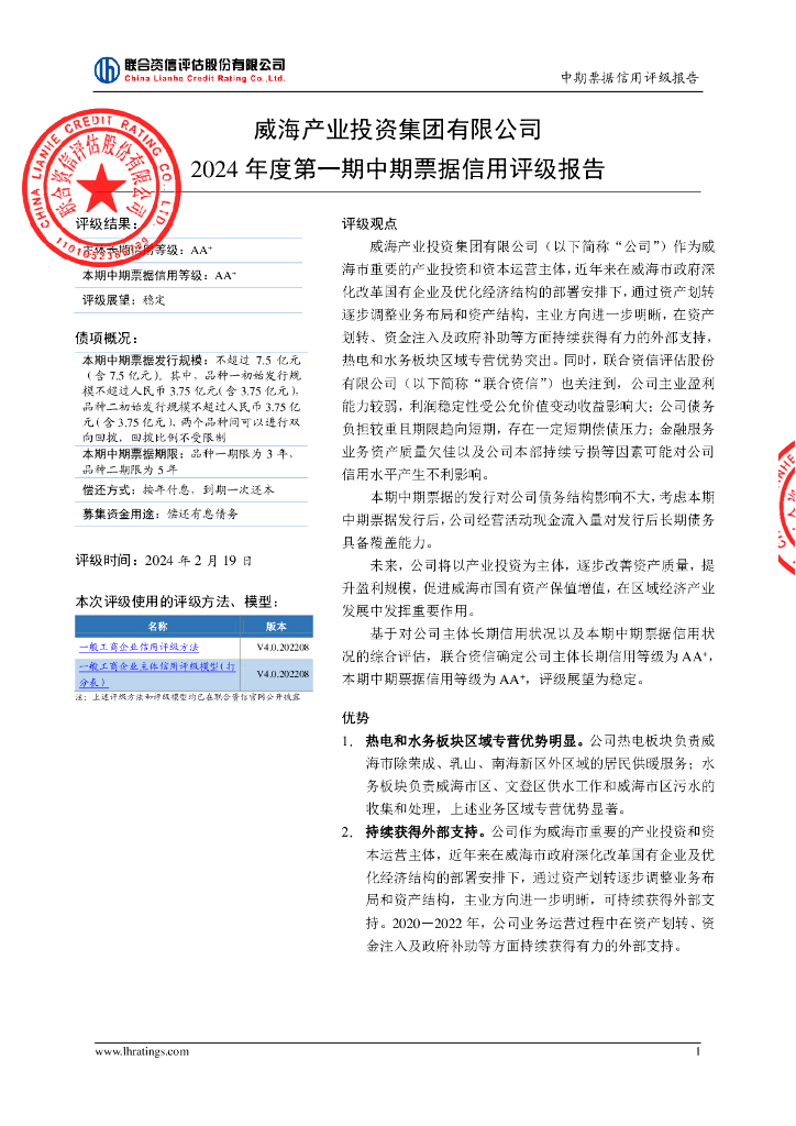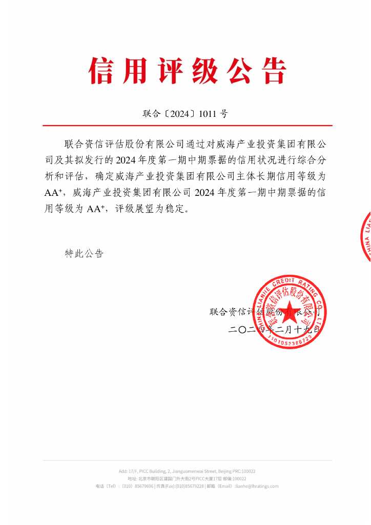 联合资信:威海产业投资集团有限公司2024年度第一期中期票据信用评级报告.pdf