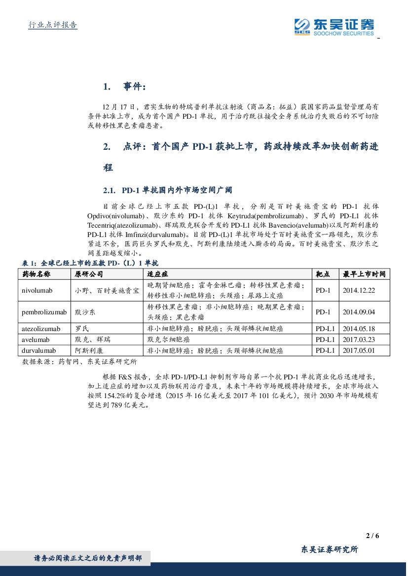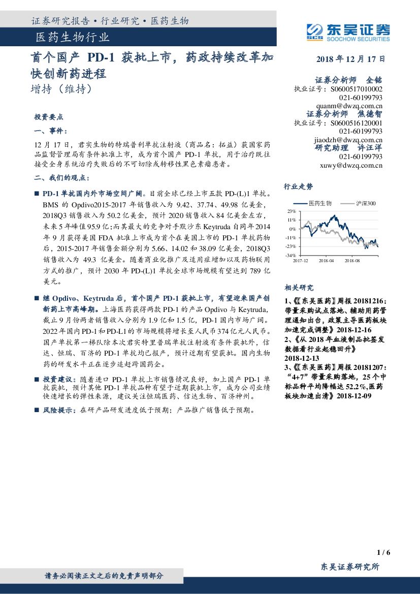 东吴证券:医药生物行业:首个国产PD-1获批上市,药政持续改革加快创新药进程.pdf