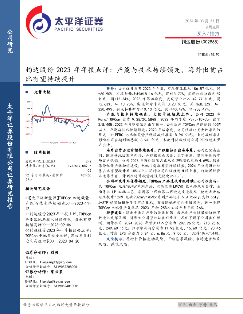 太平洋证券:钧达股份(002865)-2023年年报点评:产能与技术持续领先,海外出货占比有望持续提升.pdf