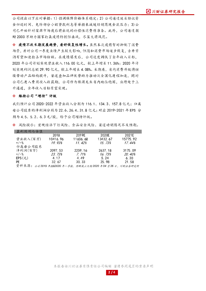 川财证券:古井贡酒(000596)-2019年报&2020年一季报点评:正式步入百亿阵营,一季度业绩受疫情影响大.pdf