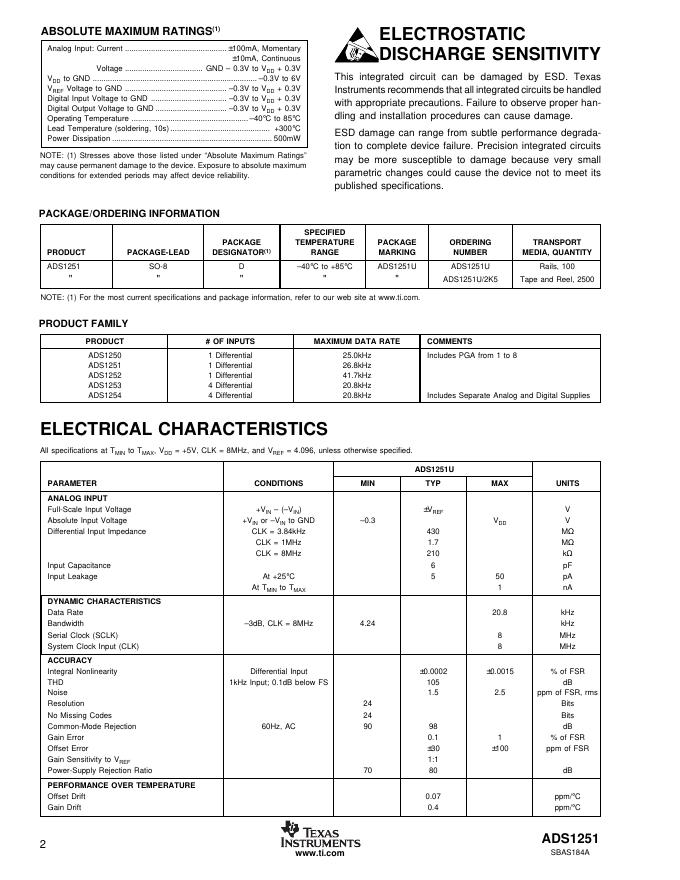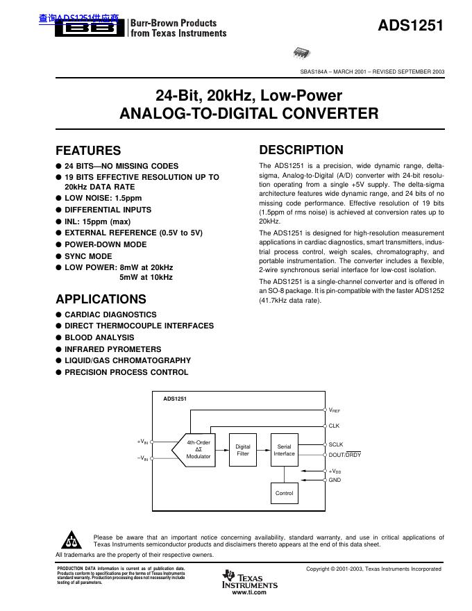 TEXAS INSTRUMENTS ADS1251 24-Bit, 20kHz, Low-Power ANALOG-TO-DIGITAL CONVERTER数据手册.pdf